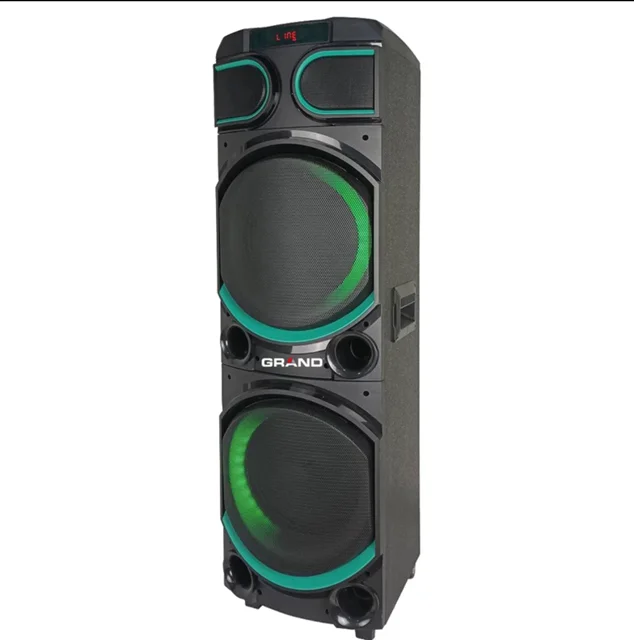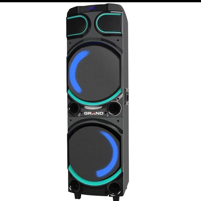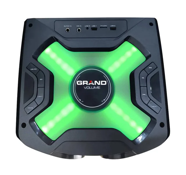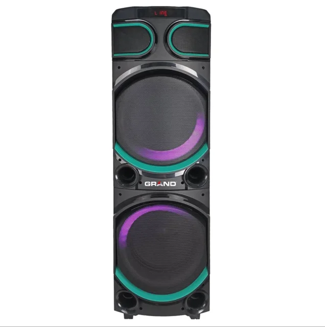 اسپیکر برقی گرندمدل: GR-8844دارای 2 ساب ووفر 10 اینچ و 2 تا تیوتر 6 اینچی دارای صفحه نمایش دیجیتال قابلیت تنظیم سیستم نورپردازی به 6 حالت پشتیبانی از کنترل و میکروفون بی سیم قابلیت ضبط کردن، شارژ موبایل، کارائوکه، کنترل و میکروفن بی سیم پشتیبانی از فرمت های AUX-USB-BT-TF Card-FM